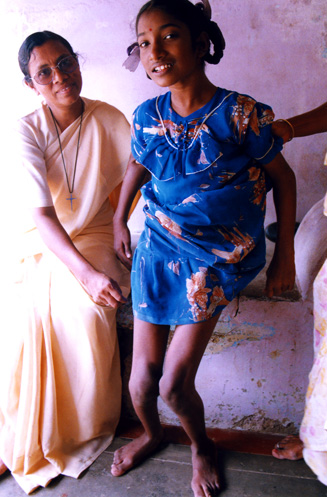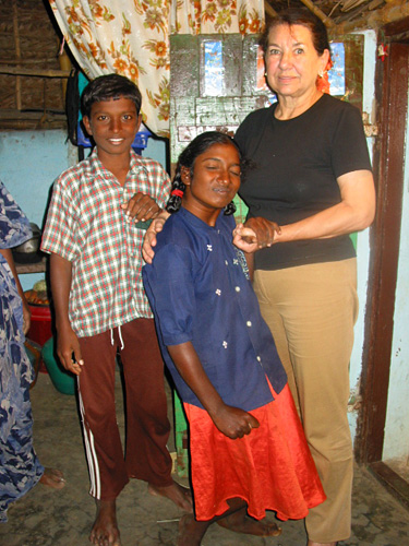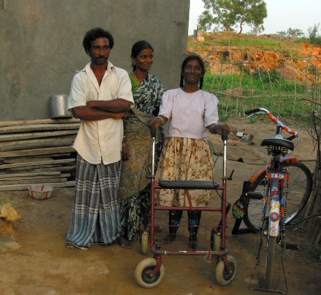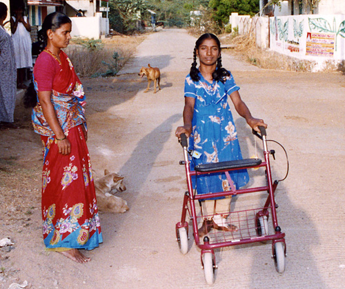 Weitere Operationen sind notwendig und werden vom Verein organisiert. Seit Kurzem geht sie mit einer von uns zur Verfügung gestellten Gehhilfe selbstständig zur nahegelegenen Schule. Ende 2009 kann Ammu zwar nur unter Mühen, aber doch ausgesprochen stolz aufrecht gehen. In der Schule entwickelt sie sich dementsprechend positiv.
